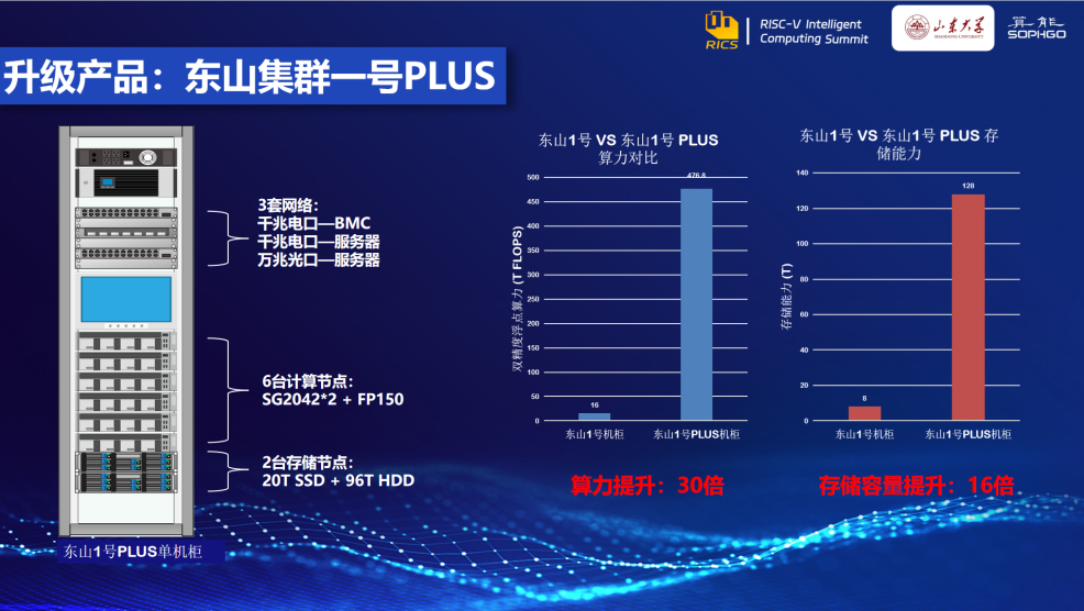 会上,戴鸿君教授详细介绍了“东山一号PLUS集群”的性能,具有千兆电口—BMC、千兆电口—服务器、万兆光口—服务器3套网络,标准机柜具有6台计算节点和2台存储节点,单机柜算力达到476.8T FLOPS,存储达到126 TB。对比与“东山一号集群”,结合TPU和RAID扩展,“东山一号PLUS集群”的算力性能提升30倍,存储容量提升16倍,可高效运行50余个AI算法模型。这是继4月24日,世界首台使用RISC-V架构的服务器集群——“东山一号集群”在山东大学成功部署并正式发布以来,东山集群在智能算力和存储扩容方面的重大升级。