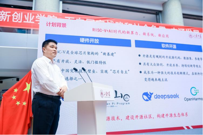 戴鸿君鼓励学生以“东山派”开发板为起点,在RISC-V与AI的交叉领域找到自己的“技术坐标”。他指出,基于当前RISC-V+AI时代的新算力、新系统、新应用格局迅速变化的背景,“东山计划”以RISC-V架构为基石,结合硬件开放和软件开源两大趋势,为学生提供覆盖芯片设计层、系统软件层和应用生态层等关键环节的系统课程体系,使得学生不仅是“技术的使用者”,更是“生态的建设者”,未来将成长为既懂硬件逻辑、又能写软件算法的交叉型人才。