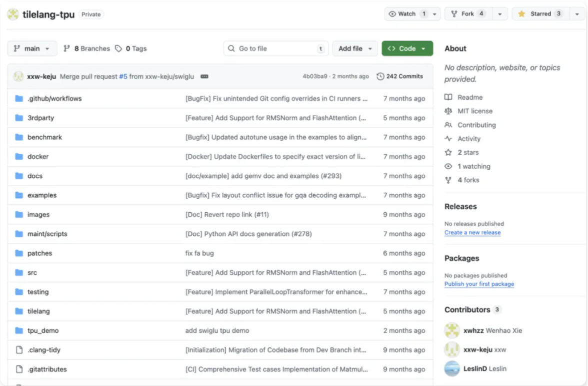 TileLang-TPU项目由北大牵头,山东大学智能创新研究院团队深度参与算子开发与模型适配工作。项目秉持“少惊扰、强约束”原则,实现TileLang前端到算能TPU后端的自动映射与性能优化,显著降低国产芯片算子开发门槛。目前,DeepSeek V3满血版在4卡SC11上吞吐超过600 tokens/s,验证了TileLang在国产TPU场景下的高效性与可扩展性。