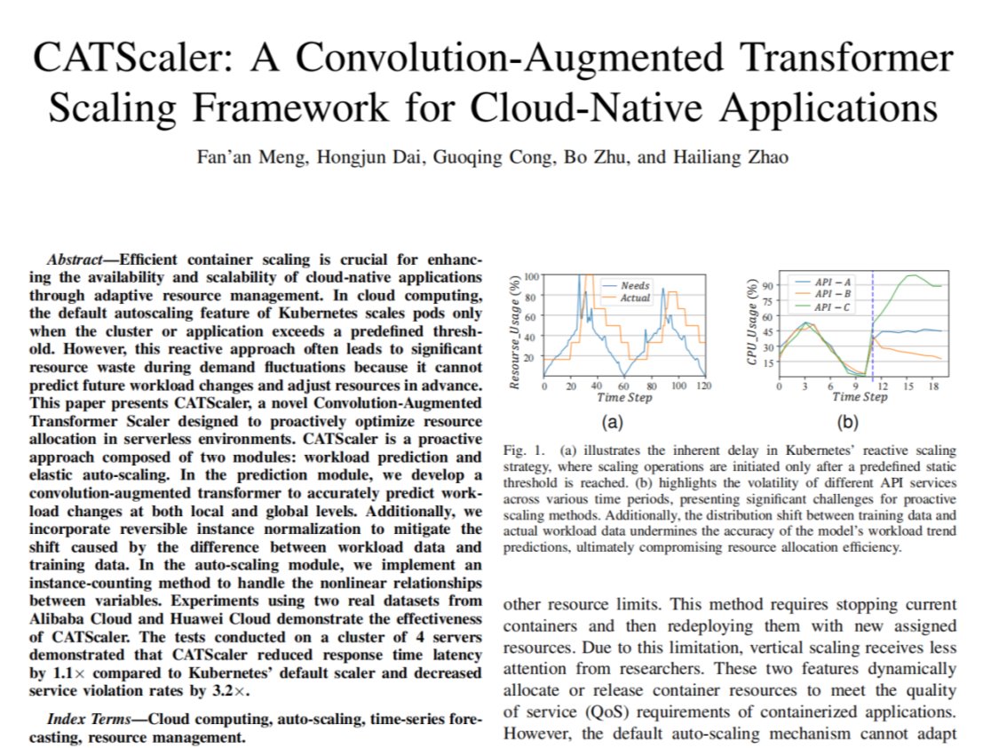 近日,2024级博士生孟凡安为第一作者、戴鸿君教授为通讯作者的论文《CATScaler: A Convolution-Augmented Transformer Scaling Framework for Cloud-Native Applications》被国际服务计算领域权威期刊《IEEE Transactions on Services Computing》正式接收,拟发表于2025年第18卷第5期,页码范围2659-2672。《IEEE Transactions on Services Computing》是服务计算领域的顶级期刊,被中国计算机学会(CCF)推荐为A类国际期刊,...